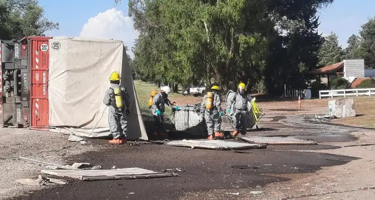 Un siniestro vial ocurrió este miércoles a la tarde sobre la Ruta Nacional 5, en el acceso a Santa Rosa, y aunque en esta ocasión no hubo víctimas, sí generó un poco de preocupación por tratarse de un material peligroso el que quedó derramado.Todo ocurrió pasadas las 15:00 horas frente al Club de Golf local. El camión involucrado pertenece a «El Pampero», una empresa de transporte de la capital pampeana, que iniciaba uno de sus habituales viajes a Buenos Aires.«Intentó pasar a una motocicleta, el acoplado se desprendió y volcó sobre la banquina… se desparramó ácido fosfórico que llevaba en unos tambores al 85%. Se le comunicó a bomberos y se trabajó incluso con personal municipal«, confió a El Diario una fuente policial. Uno de los bomberos tuvo que ser asistido por una ambulancia luego de ser afectado por el ácido fosfórico.En el siniestro, con alto grado de peligro, no solo trabajaron bomberos santarroseños, sino también de Winifreda y de Lonquimay.