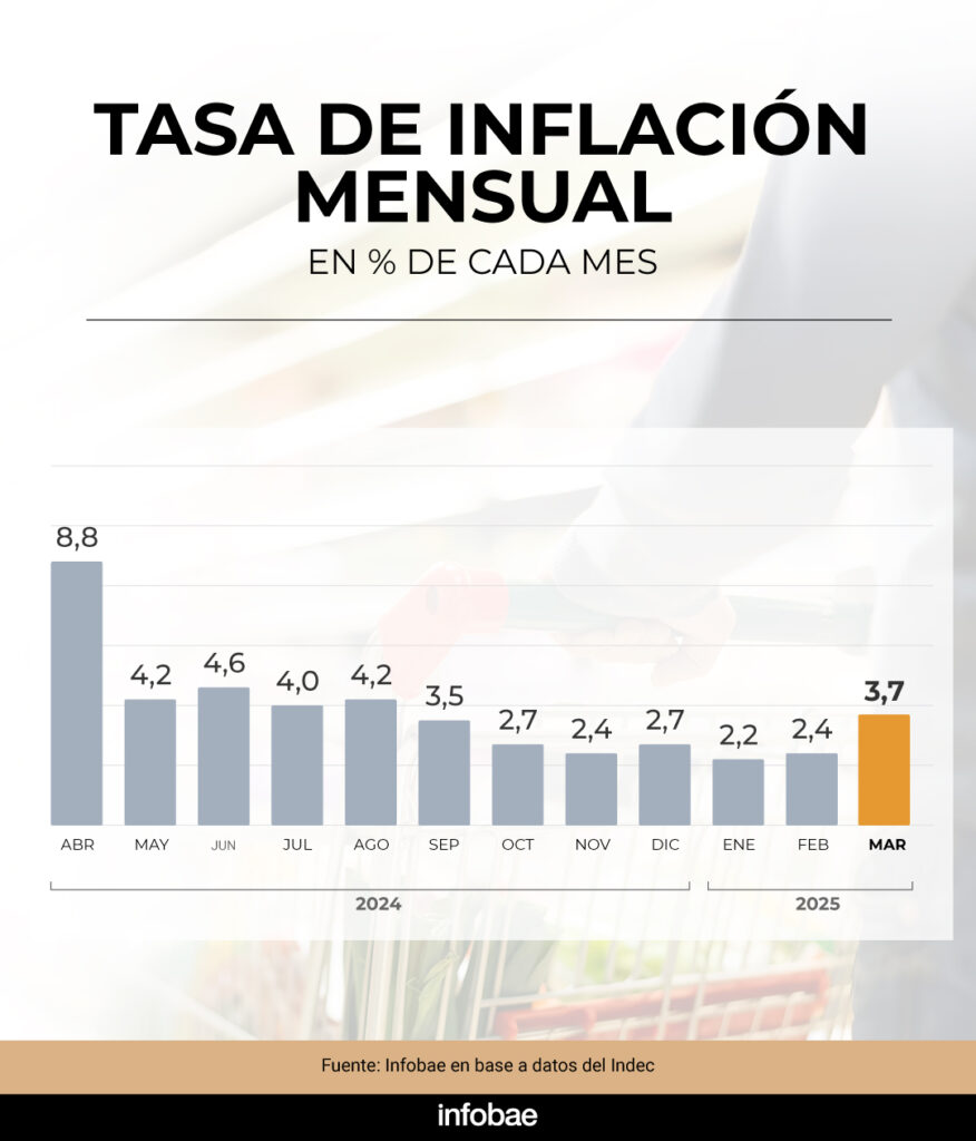 Claudio Caprarulo, economista de Analytica, dijo a Infobae: “En nuestro relevamiento todavía no observamos cambios importantes, pero con el correr de los días esperamos que empiece a reflejarse el impacto de un tipo de cambio más alto. Resta ver qué cotización del dólar van a utilizar las empresas y los comercios para calcular sus costos de reposición. Por el momento, nuestra proyección para abril y mayo es una tasa de inflación mensual superior a la de marzo (3,7 por ciento)”.“El precio de los productos importados va a subir de forma directa, mientras que en el mercado interno se va a reflejar el aumento en los precios de los productos que se exportan o que se elaboran a partir de los mismos”, sostuvo. Es que las variaciones en el tipo de cambio se trasladan inmediatamente a los bienes transables.Nuestra proyección para abril y mayo es una tasa de inflación mensual superior a la de marzo -3,7 por ciento- (Caprarulo)Desde otra perspectiva, la economista de C&T Asesores Económicos, María Castiglioni, consideró que el oficial se está ubicando en el medio de la banda definida, por lo cual no hay tanta diferencia con el blend, que era el tipo de cambio al que liquidaban los exportadores.Para la especialista, asumiendo un pass through relativamente alto, pero teniendo en cuenta que hubo cierto anticipo, la inflación de abril va a terminarpor debajo del 3 por ciento.infografiaJerónimo Montalvo, economista de Abeceb, explicó: “El nuevo esquema cambiario de bandas produjo una suba del tipo de cambio oficial en torno al 10% en sus primeros días -a una cotización aproximada de $1.200 – y se espera que se mantenga estable en estos valores-, lo cual tendría un impacto de corto plazo en la inflación, aunque sería transitoria y acotada por el mejor contexto macroeconómico (con orden fiscal y monetario) y la apertura y desregulación comercial”.Además, “muchas empresas ya estaban utilizando los dólares alternativos como referencia, entonces no deberían tener demasiados cambios en sus costos”, apuntó.Muchas empresas ya estaban utilizando los dólares alternativos como referencia, entonces no deberían tener demasiados cambios en sus costos (Montalvo)Proyectó que la inflación se ubicaría durante dos meses por encima de los valores previos, superando el 4%, y, ya para junio, bajo el supuesto de estabilidad cambiaria, mostraría una sensible baja que continuaría su sendero hacia fin de año, cerrando el 2025 en torno al 30 por ciento.La economista de EcoGo Rocío Bisang apuntó: “Por ahora esperamos ver una leve aceleración de los precios, considerando también el arrastre que deja marzo, aunque no esperamos un salto desmedido ya que hoy el dólar está moviéndose más cerca de la banda inferior y con ingresos y una demanda que no terminan de recuperarse”.