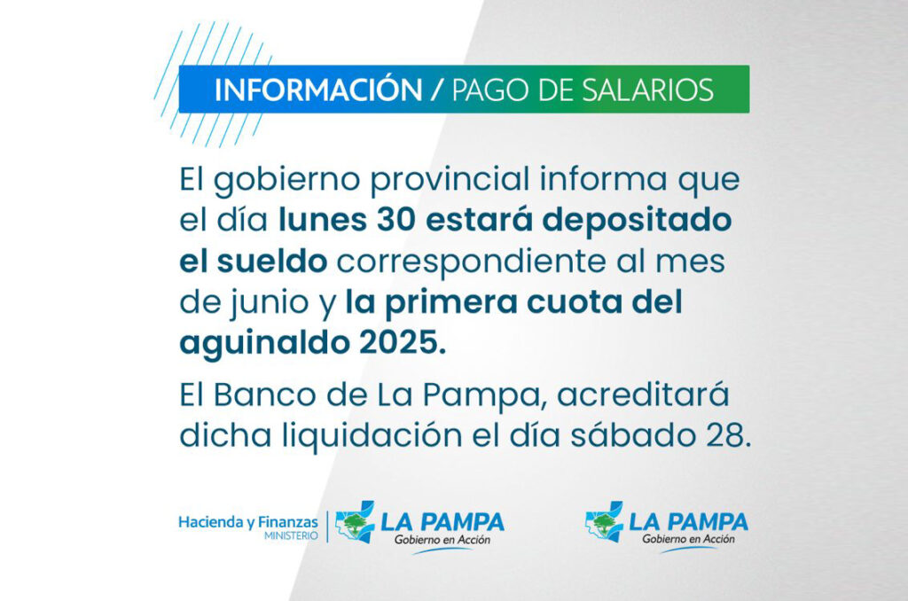 El Gobierno provincial informó que el día lunes 30 del presente mes, se encontrarán depositados los haberes de los agentes estatales, correspondientes al mes de junio y la primera cuota del aguinaldo 2025.El Banco de La Pampa acreditará dicha liquidación el día sábado 28.