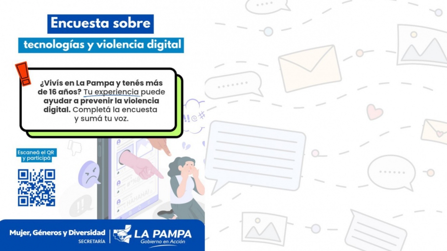 Con el objetivo de relevar experiencias, percepciones y conocimientos vinculados al uso de tecnologías y a las distintas formas de violencia digital, el Observatorio de la Secretaría de la Mujer, Géneros y Diversidad del Gobierno de La Pampa lanza una encuesta destinada a todas las personas mayores de 16 años que residan en la Provincia.La violencia digital se manifiesta a través de medios digitales y puede implicar la vulneración de derechos, afectando la vida privada, emocional y la imagen de las personas. La información recolectada permitirá diseñar políticas públicas y estrategias de prevención más efectivas, promoviendo entornos digitales más seguros, respetuosos e inclusivos para toda la comunidad pampeana. El formulario se encuentra disponible en el sitio web y redes sociales oficiales de la Secretaría y puede completarse de forma online a través del siguiente enlace: https://bit.ly/4jAYiko.Desde la Secretaría se invitó a la ciudadanía a participar activamente de esta propuesta, entendiendo que la construcción de una cultura digital libre de violencias es una responsabilidad colectiva.
