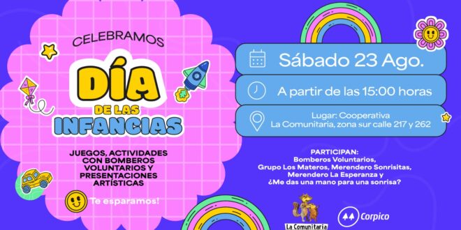 Este sábado 23 de agosto, la Cooperativa de Servicios Públicos de General Pico (Corpico) celebrará el Día de las Infancias con una jornada repleta de actividades gratuitas para toda la familia. El evento se desarrollará a partir de las 15:00 horas en las instalaciones de la Cooperativa La Comunitaria, situada en la intersección de las calles 217 y 262, en el barrio Sur de la ciudad.La propuesta está pensada para que los más chicos disfruten de una tarde inolvidable, con una variada agenda que incluye juegos, la participación especial de los Bomberos Voluntarios, y una serie de espectáculos que abarcarán teatro, circo, murga y zumba, entre muchas otras sorpresas.La entrada será libre y gratuita, con el objetivo de que todas las familias de la comunidad puedan acercarse a compartir un momento de alegría y entretenimiento. Para cerrar la jornada, se servirá chocolate caliente y torta para todos los presentes, completando así una tarde festiva.Esta celebración es fruto del trabajo conjunto y la colaboración de diversas instituciones y agrupaciones locales. Junto a Corpico y la anfitriona, Cooperativa La Comunitaria, participan los Bomberos Voluntarios, el Grupo Los Materos, los merenderos Sonrisitas, La Esperanza y ¿Me das una mano para una sonrisa?, además de todos los artistas que se suman desinteresadamente a la propuesta.