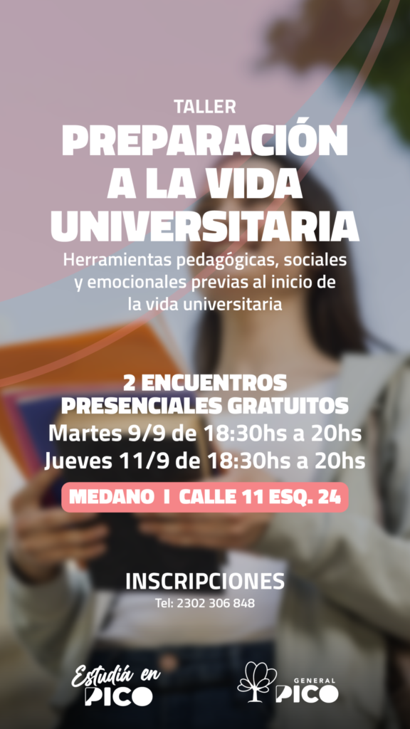 La Municipalidad de General Pico anunció la apertura de inscripciones para el taller gratuito “Preparación a la Vida Universitaria”, una iniciativa destinada a estudiantes que cursan el último año del nivel secundario. La capacitación se dictará el martes 9 y jueves 11 de septiembre, a las 18:30, en las instalaciones del Centro Cultural MEDANO, ubicado en calle 11 esquina 24.El ingreso a la universidad constituye una etapa de transición significativa en la vida de los estudiantes, lo que implica nuevos desafíos académicos. Por ello, esta propuesta busca ofrecer un espacio donde los participantes encontrarán herramientas para favorecer su autonomía, la organización del tiempo, el manejo de la información, el desarrollo de habilidades de estudio y el fortalecimiento de competencias socioemocionales.El taller está estructurado en dos encuentros presenciales, cada uno con una duración aproximada de una hora y media. Para participar en esta actividad, quienes estén interesados pueden inscribirse llamando al teléfono 2302-306848, en el horario de 7:00 a 18:00.