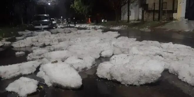 Una fuerte granizada se registró en la madrugada de este sábado en la ciudad de Santa Rosa, pasadas las 5.30 horas, y dejó un escenario de calles anegadas y sectores cubiertos de hielo.El meteorólogo Jeremías Baraldi, de la comunidad La Pampa Tierra de Tormentas, publicó videos y fotos con la formación de verdaderos “ríos de agua y granizo” en algunos sectores de la ciudad.El fenómeno, de corta duración pero de gran intensidad, provocó complicaciones en la circulación y generó preocupación entre los habitantes que se despertaron con el estruendo de la caída de las piedras.Hubo complicaciones en distintos barrios de la capital Pampeana.Recordemos que para el sur y parte del centro de La Pampa.estaba vigente un alerta naranja por tormentas intensas y posible caída de granizo.