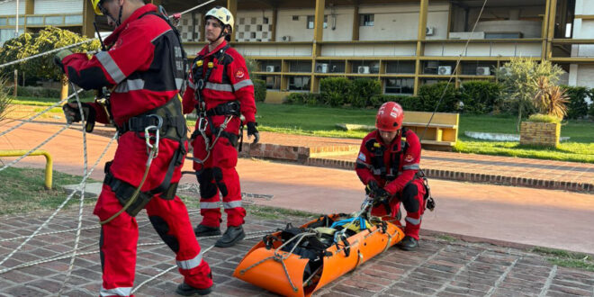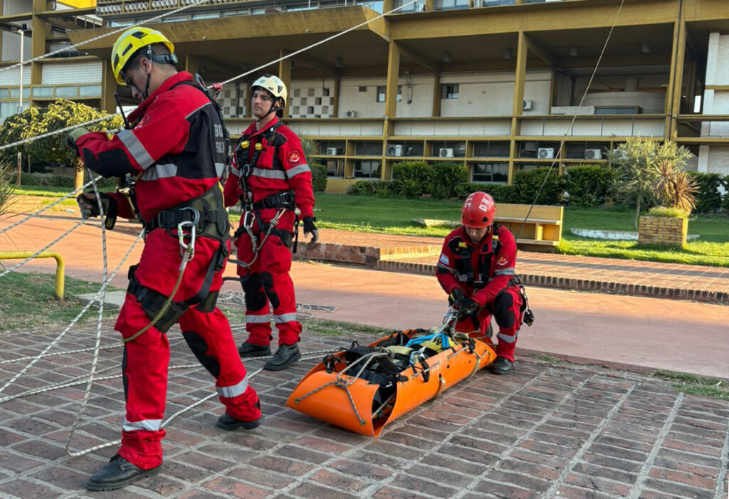 Durante la práctica se montó un sistema con dos cabeceras, superior e inferior, que permitió ejecutar distintas maniobras de rescate técnico. Entre ellas se desarrollaron descensos controlados a rápel, rescates por tirolina, ascensos por cuerdas paralelas, traslado de una víctima en camilla y ejercicios de estabilización en suspensión. Como cierre institucional, dos rescatistas realizaron un descenso simultáneo portando el Pabellón Nacional, marcando el final de la exhibición.El jefe del Cuerpo de Bomberos de la Policía de La Pampa, comisario inspector Ricardo Collado, explicó a la Agencia Provincial de Noticias que la iniciativa surgió del propio personal especializado. “El personal de cuerdas vino con la propuesta de conmemorar los cinco años de la creación de la División de Rescate con Cuerda con una exhibición visible para la comunidad en Casa de Gobierno. Con las autorizaciones correspondientes se pudo realizar esta práctica que ya estaba entrenada, pero que tuvo un sentido institucional y conmemorativo”, señaló.En ese sentido, Collado destacó el crecimiento del área en estos años. “Años atrás no teníamos nada de lo que hoy se ve: overoles, cascos, guantes, arneses, cuerdas, camillas de rescate. Todo ese equipamiento se fue incorporando de a poco, en gran parte a través del Ministerio de Seguridad y Justicia y también con la colaboración de empresas que aportaron mosquetones, cuerdas, cascos y otros elementos”, remarcó.