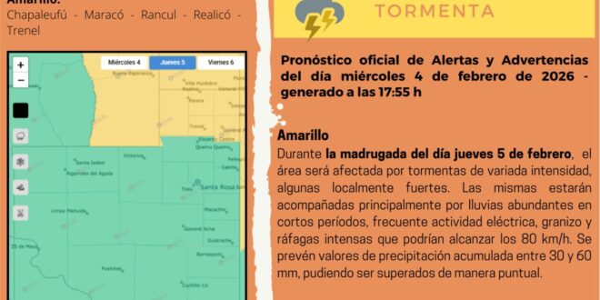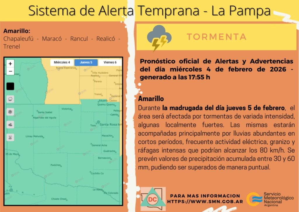 En un reporte emitido a las 18:23 horas, el organismo nacional lanzó un aviso a corto plazo por tormentas fuertes con lluvias intensas, ráfagas y ocasional caída de granizo. Esta advertencia inmediata afecta específicamente a la zona oeste de la provincia, comprendiendo los departamentos de Chalileo y Chical Co.Alerta amarilla para la madrugada del juevesAsimismo, el Sistema de Alerta Temprana ha colocado bajo alerta amarilla a una amplia región del norte pampeano. Esta situación se desarrollará principalmente durante la madrugada del día jueves 5 de febrero.Las zonas afectadas por esta alerta amarilla incluyen los departamentos de Chapaleufú, Maracó, Rancul, Realicó y Trenel. Esto implica que la ciudad de General Pico y localidades vecinas deberán tomar los recaudos necesarios ante la inminente llegada del frente de tormenta.Detalles del fenómeno esperadoSegún el informe oficial, el área será afectada por tormentas de variada intensidad, algunas de las cuales pueden ser localmente fuertes. Se prevé que estos fenómenos estén acompañados principalmente por:Abundante caída de agua en cortos períodos.Frecuente actividad eléctrica.Ocasional caída de granizo.Ráfagas intensas que podrían alcanzar los 80 km/h.