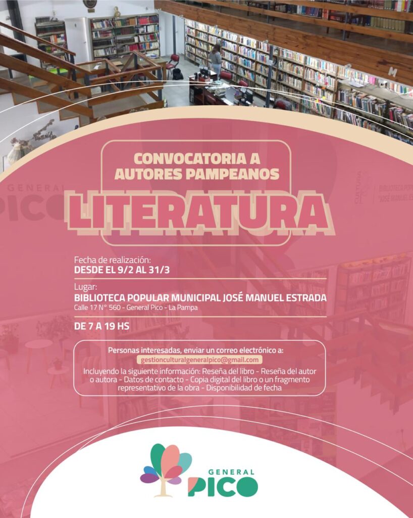La Municipalidad de General Pico anunció la apertura de una convocatoria destinada a escritores pampeanos que deseen presentar sus obras en la Biblioteca Popular Municipal “José Manuel Estrada”. Esta iniciativa tiene como finalidad conformar la agenda 2026 de actividades literarias en la institución. El período de inscripción estará vigente a partir del 9 de febrero y culminará el 31 de marzo.Para participar, los interesados deberán enviar un correo electrónico a la dirección gestioncultural@generalpico.com, en el horario de 7:00 a 19:00. En la solicitud es requisito indispensable incluir una reseña del libro, una reseña del autor, los datos de contacto y una copia digital del libro o un fragmento representativo de la obra. Asimismo, se debe detallar la disponibilidad de fecha, con la posibilidad de indicar un mes aproximado para concretar la presentación durante el primer semestre.