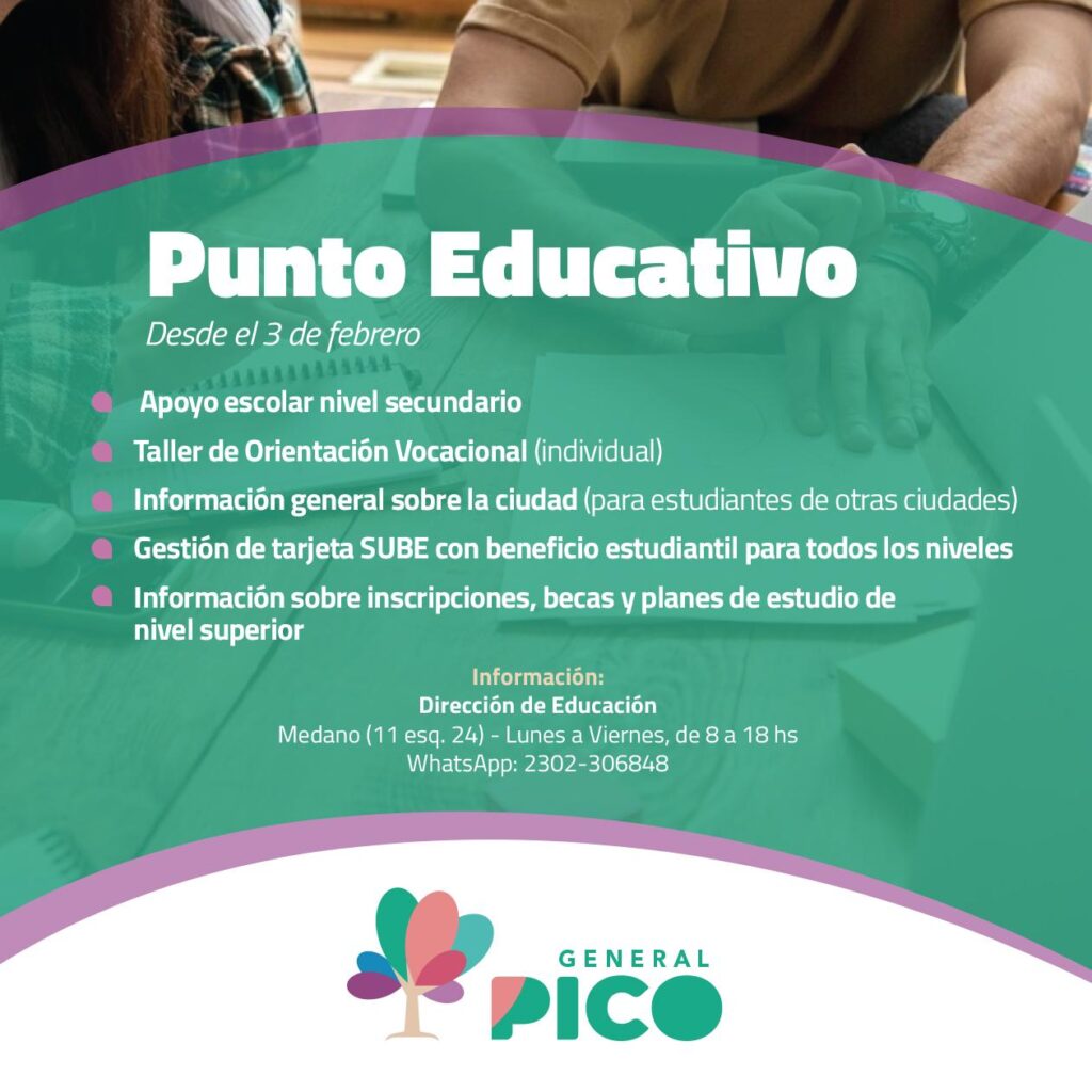 La Municipalidad de General Pico informa que se encuentra a disposición de la comunidad el Punto Educativo, un espacio pensado para acompañar, orientar y brindar herramientas a estudiantes a través de apoyo escolar de nivel secundario y talleres de orientación vocacional individual.Los interesados ya pueden inscribirse en la Dirección de Educación, ubicada en MEDANO, en calles 11 y 24, de lunes a viernes de 8:00 a 18:00. También podrán realizar consultas a través de WhatsApp, comunicándose al número 2302-306848.