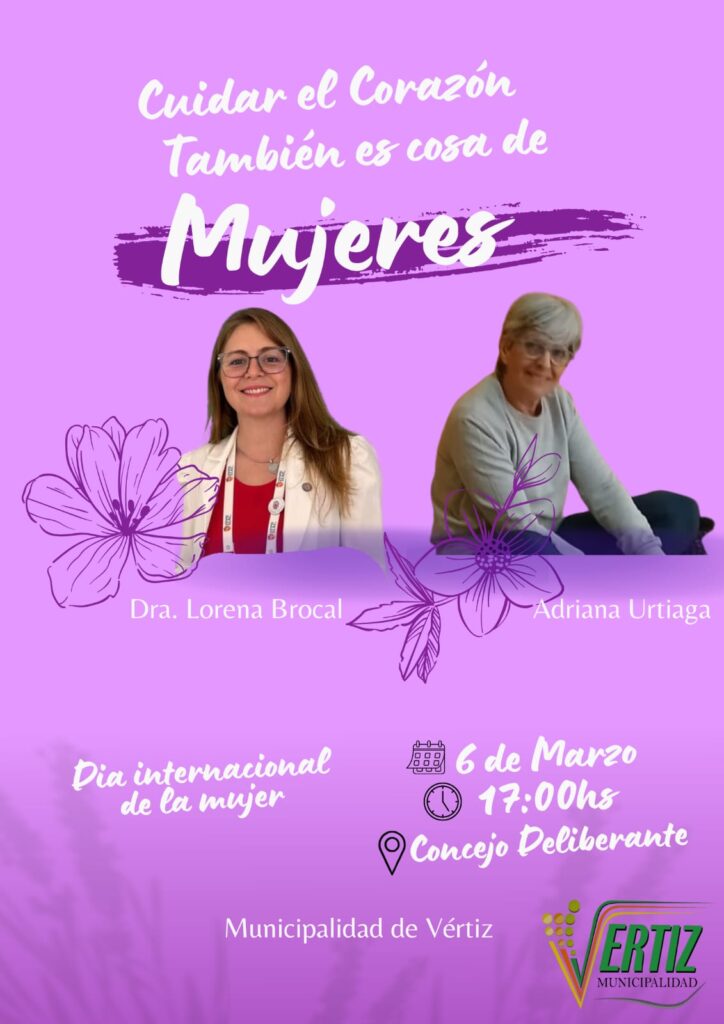 En el marco del Mes de la Mujer, invitamos a todas las mujeres de la localidad a participar de una jornada de cuidado, información y bienestar pensada especialmente para nosotras.Contaremos con la charla de la Doctora Lorena Brocal, quien brindará información sobre prevención de enfermedades cardiovasculares, y con un espacio de yoga a cargo de Adriana Urtiaga, para compartir un momento de conexión y bienestar. También disfrutaremos de una merienda saludable y realizaremos un sorteo entre todas las participantes.Invitamos a quienes asistan a llevar alguna prenda o accesorio rojo, en representación de la Federación Argentina de Cardiología, como símbolo de concientización sobre el cuidado del corazón.Un espacio para informarnos, conectar y recordar que cuidarnos también es prioridad 🤍❤️