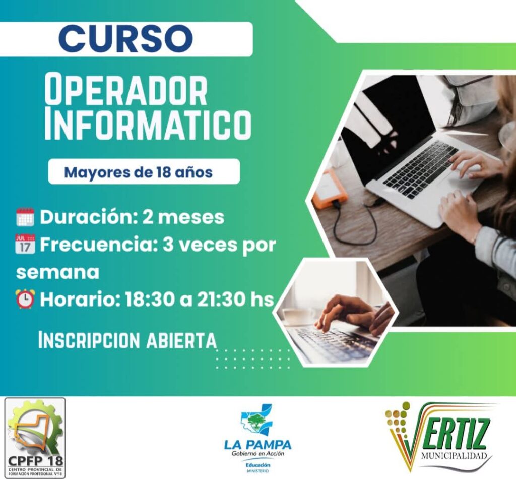 💻 Destinado a mayores de 18 años🗓️ Duración: 2 meses📅 Frecuencia: 3 veces por semana⏰ Horario: 18:30 a 21:30 hs📝 Inscripción abierta👆🏼 Enlace PREINSCRIPCIÓNATM 11 – Informática – Vértiz https://forms.gle/Cu3ugesAY48mdqaw8📚 Contenidos: • Manejo básico de computadora• Paquete Microsoft (Word y Excel)• Uso de Canva• Introducción a Internet• ¡Y mucho más!✅ Requisito: 80% de asistencia👩🏫 Profesora: Florencia Pozo📲 Consultas: Área Social