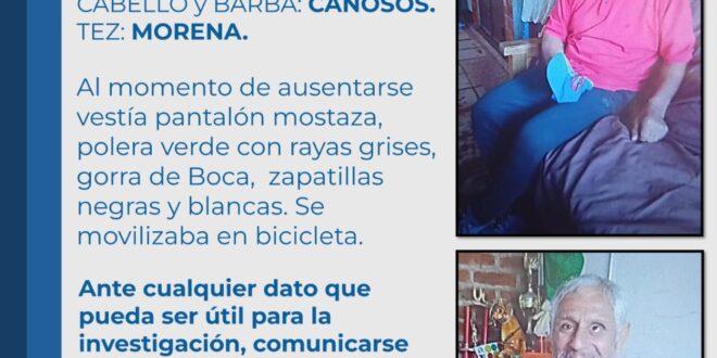 En cuanto a la indumentaria que llevaba puesta al momento de salir de su vivienda, se detalló que vestía un pantalón de color mostaza, una polera verde con rayas grises, una gorra de Boca Juniors y zapatillas en tonos negro y blanco.Líneas de contactoDesde el Ministerio Público y la Policía de La Pampa ruegan a cualquier persona que lo haya visto transitar por la vía pública o que posea información de utilidad para la investigación, que se comunique de forma inmediata.Quienes puedan aportar cualquier tipo de dato deben llamar urgente a la línea de emergencias 101, comunicarse al teléfono de la Comisaría Primera de General Pico (02302-421954), o bien acercarse a la dependencia policial más cercana a su domicilio.