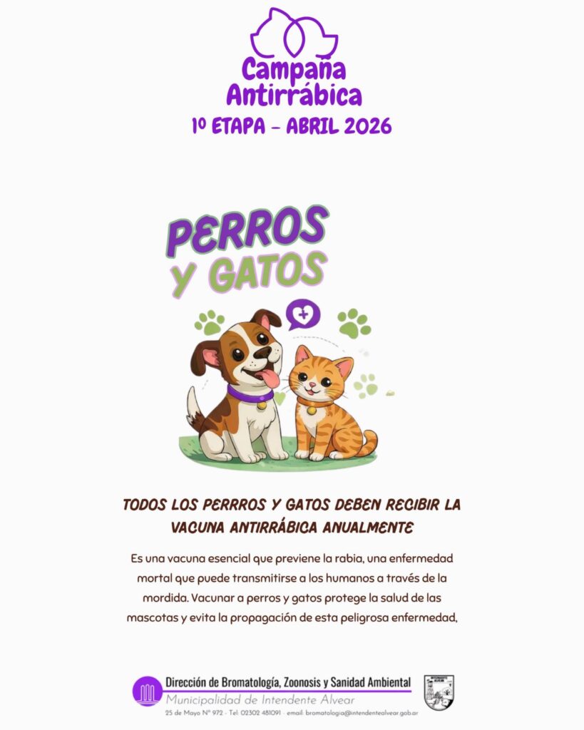 La Dirección de Bromatología, Zoonosis y Sanidad Ambiental de la Municipalidad de Intendente Alvear informó que durante el mes de abril se llevará a cabo la primera etapa de la campaña de vacunación antirrábica correspondiente al año 2026, destinada a perros y gatos de la localidad pampeana.