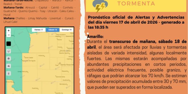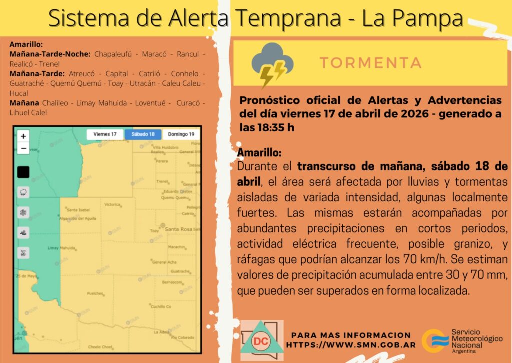 INFORMACIÓN BRINDADA DESDE EL SERVICIO METEOROLOGICO NACIONALALERTA AMARILLO DE TORMENTAPARA LOS DEPARTAMENTOS: *Mañana-Tarde-Noche:* Chapaleufú – Maracó – Rancul – Realicó – Trenel *Mañana-Tarde:* Atreucó – Capital – Catriló – Conhelo – Guatraché – Quemú Quemú – Toay – Utracán – Caleu Caleu – Hucal*Mañana:* Chalileo – Limay Mahuida – Loventué – Curacó – Lihuel CalelFecha: 17/04/2026 – 18:35 Hs. https://www.smn.gob.ar/alertas AmarilloDurante el *transcurso de mañana, sábado 18 de abril*, el área será afectada por lluvias y tormentas aisladas de variada intensidad, algunas localmente fuertes. Las mismas estarán acompañadas por abundantes precipitaciones en cortos periodos, actividad eléctrica frecuente, posible granizo, y ráfagas que podrían alcanzar los 70 km/h. Se estiman valores de precipitación acumulada entre 30 y 70 mm, que pueden ser superados en forma localizada.